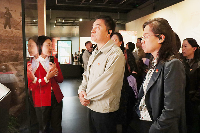 为深入学习贯彻习近平文化思想,深刻领会“两个结合”的重大意义,实地感受中华优秀传统文化的博大精深与时代价值,10月11日,我院办公室、文化研究所、理论宣讲处、百姓宣讲处、网络宣讲处、宣讲服务处、机关工会7个党支部联合组织主题党日活动,集体前往大运河博物馆参观“看・见殷商”展览,共同领略跨越三千年的殷商历史文化。院党组书记谢辉,党组副书记、院长贺亚兰,党组成员、副院长朱霞辉及相关支部党员一同参加活动。