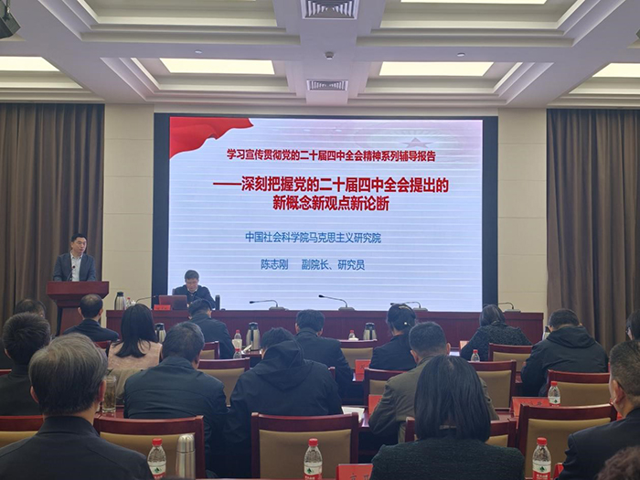 会上,中国社会科学院马克思主义研究院纪委书记、副院长陈志刚围绕党的二十届四中全会精神作专题报告。报告以全会精神为指引,深入分析"十五五"时期的历史方位及我国发展面临的形势,聚焦"十五五"时期经济社会发展的指导方针和主要目标,从把握高质量发展主题,做强国内大循环、畅通国内国际双循环,推动全体人民共同富裕迈出坚实步伐,统筹发展和安全、健全国家安全体系四个方面,对党的二十届四中全会的重大意义、精神实质和实践要求作了系统梳理和精准解读。通过学习,与会人员对全会就"十五五"经济社会发展作出的顶层设计和战略擘画有了更加深刻的认识,对全会提出的新概念、新观点、新论断有了更加透彻的理解,对实现"十五五"时期经济社会发展蓝图有了更为坚定的信心。
