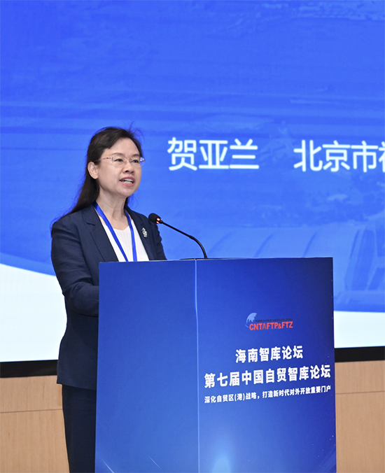贺亚兰在《扛起使命担当 汇聚众智合力,建设高水平中国特色海南自由贸易港》的主旨发言中指出,海南建设中国特色自由贸易港是习近平总书记亲自谋划、亲自部署、亲自推动的重大国家战略,是党中央着眼于国内国际两个大局、推动中国特色社会主义创新发展作出的重大决策。在谈及扛起建设全面深化改革开放试验区的重大使命方面,她指出,海南自贸港在制度集成创新、产业体系构建、开放能级提升等方面取得显著成效,奠定了新时代对外开放门户的基础和条件。未来海南自贸港建设需主动服务国家高质量发展大局,加强与粤港澳大湾区、长三角及中西部地区协同,与北京"两区"建设相互借鉴,助力构建新发展格局。在谈及激活发展新动能方面,她提出,应将制度集成创新置于突出位置,对标RCEP、CPTPP等国际高标准经贸规则,破解体制机制障碍。同时立足资源禀赋,推动旅游业向度假康养等转型,现代服务业向高端国际化升级,高新技术产业从"引进来"向"自主创新"转变,完善热带特色高效农业产业链,构建特色鲜明的现代化产业体系。她强调,海南自贸港建设需彰显"红色基因、民族风情、海洋特质"的文化底色,筑牢安全屏障,加强金融风险防控、智慧口岸建设和生态环境保护,实现自贸港开放与安全协同发展。