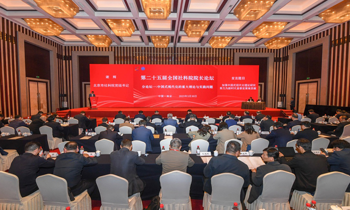 3月30日,由江苏省社会科学院主办的第二十五届全国社会科学院院长论坛在南京举行。本次论坛的主题为"以中国式现代化全面推进中华民族伟大复兴"。中共江苏省委常委、宣传部部长张爱军,中国社会科学院科研局局长崔建民出席会议并讲话。江苏省社会科学院党委书记、院长夏锦文主持开幕式并致辞。北京市社会科学院党组书记谢辉,办公室、科研组织处、人事处、国际问题研究所负责人参加会议。来自中国社会科学院和31个省(市、区)社会科学院的领导和专家代表,中共江苏省委宣传部、江苏省哲学社会科学规划办公室及南京市有关部门的负责同志,中国知网和新闻媒体的代表200多人参会研讨。