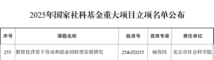 近日,全国哲学社会科学工作办公室公布了2025年度国家社科基金重大项目立项名单。我院党组副书记、副院长杨伟国教授作为首席专家申报的《数智化背景下劳动和就业的转型发展研究》获国家社科基金重大项目批准立项。